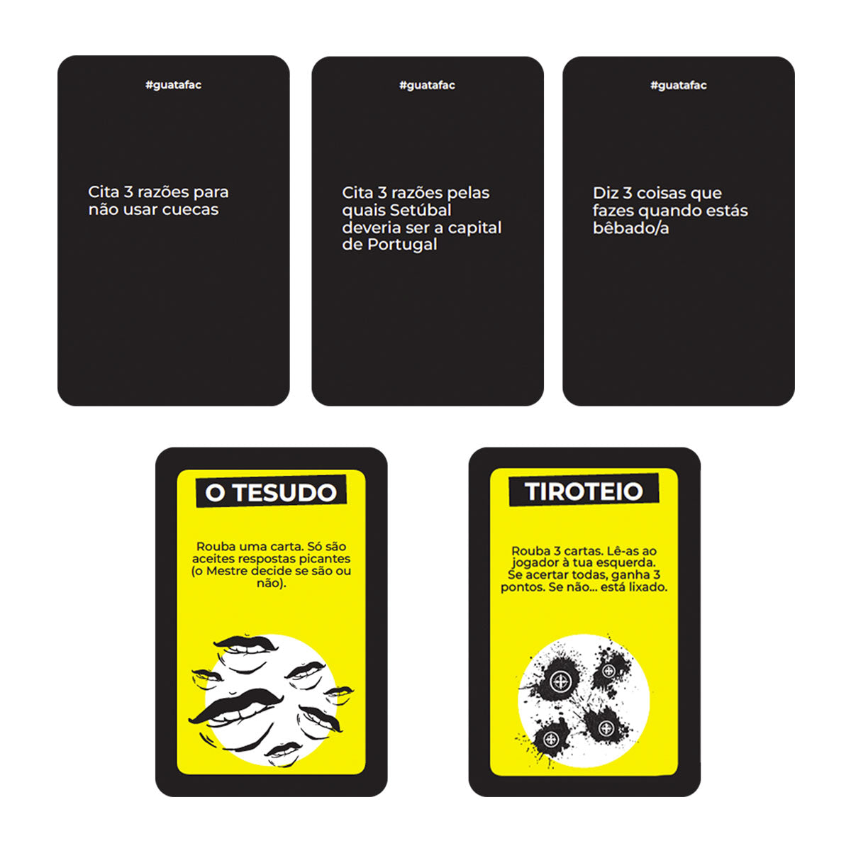 O jogador tem 8 segundos para dar as respostas mais estranhas dos seus amigos, família ou até estranhos. Com 400 cartas e 80 especiais, os jogadores vão rir, provocar e somar pontos. Se o Mestre aceitar as suas respostas, a carta fica para si! Use os dedos ou descarregue a app grátis para marcar o tempo. Quem juntar 7 cartas torna-se o rei do Guatafac!